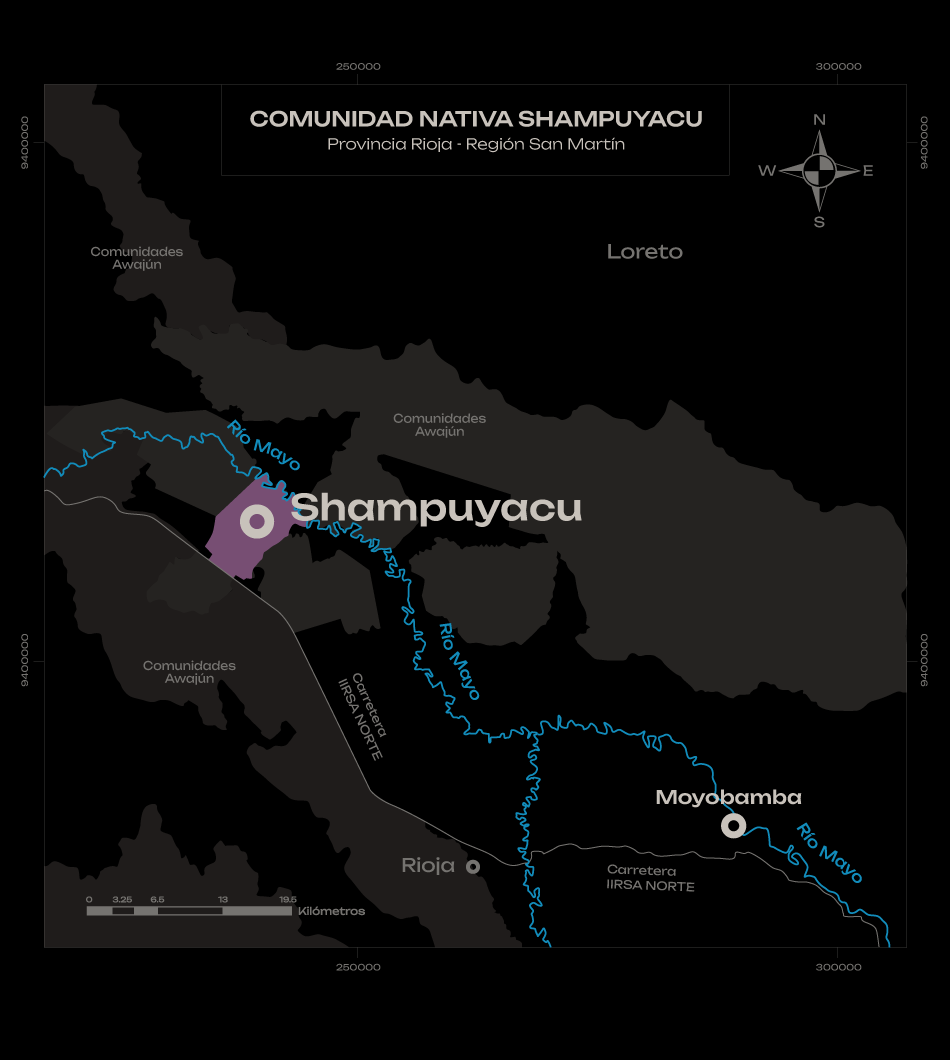 La comunidad nativa Shampuyacu se encuentra en el corazón del valle del Alto Mayo, en el departamento de San Martín. Ahí viven unas 300 familias, que cuentan con 4926 hectáreas de territorio. Está ubicada cerca al Bosque de Protección Alto Mayo, el área protegida más poblada del país, reconocida internacionalmente por su alta biodiversidad y responsable del abastecimiento de agua a las ciudades de Rioja y Moyobamba.
